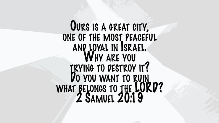 1There happened to be there a base fellow, whose name was Sheba, the son of Bichri, a Benjamite: and he blew the trumpet, and said, We have no portion in David, neither have we inheritance in the son of Jesse: every man to his tents, Israel. 2So all the men of Israel went up from following David, and followed Sheba the son of Bichri; but the men of Judah joined with their king, from the Jordan even to Jerusalem. 3David came to his house at Jerusalem; and the king took the ten women his concubines, whom he had left to keep the house, and put them in custody, and provided them with sustenance, but didn't go in to them. So they were shut up to the day of their death, living in widowhood. 4Then said the king to Amasa, Call me the men of Judah together within three days, and be here present. 5So Amasa went to call [the men of] Judah together; but he stayed longer than the set time which he had appointed him. 6David said to Abishai, Now will Sheba the son of Bichri do us more harm than did Absalom: take your lord's servants, and pursue after him, lest he get him fortified cities, and escape out of our sight. 7There went out after him Joab's men, and the Cherethites and the Pelethites, and all the mighty men; and they went out of Jerusalem, to pursue after Sheba the son of Bichri. 8When they were at the great stone which is in Gibeon, Amasa came to meet them. Joab was girded with his apparel of war that he had put on, and thereon was a sash with a sword fastened on his loins in the sheath of it; and as he went forth it fell out. 9Joab said to Amasa, Is it well with you, my brother? Joab took Amasa by the beard with his right hand to kiss him. 10But Amasa took no heed to the sword that was in Joab's hand: so he struck him therewith in the body, and shed out his bowels to the ground, and didn't strike him again; and he died. Joab and Abishai his brother pursued after Sheba the son of Bichri. 11There stood by him one of Joab's young men, and said, He who favors Joab, and he who is for David, let him follow Joab. 12Amasa lay wallowing in his blood in the midst of the highway. When the man saw that all the people stood still, he carried Amasa out of the highway into the field, and cast a garment over him, when he saw that everyone who came by him stood still. 13When he was removed out of the highway, all the people went on after Joab, to pursue after Sheba the son of Bichri. 14He went through all the tribes of Israel to Abel, and to Beth Maacah, and all the Berites: and they were gathered together, and went also after him. 15They came and besieged him in Abel of Beth Maacah, and they cast up a mound against the city, and it stood against the rampart; and all the people who were with Joab battered the wall, to throw it down. 16Then cried a wise woman out of the city, "Hear, hear! Please say to Joab, 'Come near here, that I may speak with you.'" 17He came near to her; and the woman said, Are you Joab? He answered, I am. Then she said to him, Hear the words of your handmaid. He answered, I do hear. 18Then she spoke, saying, They were wont to speak in old time, saying, They shall surely ask [counsel] at Abel: and so they ended [the matter]. 19I am of those who are peaceable and faithful in Israel: you seek to destroy a city and a mother in Israel: why will you swallow up the inheritance of Yahweh? 20Joab answered, Far be it, far be it from me, that I should swallow up or destroy. 21The matter is not so: but a man of the hill-country of Ephraim, Sheba the son of Bichri by name, has lifted up his hand against the king, even against David; deliver him only, and I will depart from the city. The woman said to Joab, Behold, his head shall be thrown to you over the wall. 22Then the woman went to all the people in her wisdom. They cut off the head of Sheba the son of Bichri, and threw it out to Joab. He blew the trumpet, and they were dispersed from the city, every man to his tent. Joab returned to Jerusalem to the king. 23Now Joab was over all the host of Israel; and Benaiah the son of Jehoiada was over the Cherethites and over the Pelethites; 24and Adoram was over the men subject to forced labor; and Jehoshaphat the son of Ahilud was the recorder; 25and Sheva was scribe; and Zadok and Abiathar were priests; 26and also Ira the Jairite was chief minister to David.