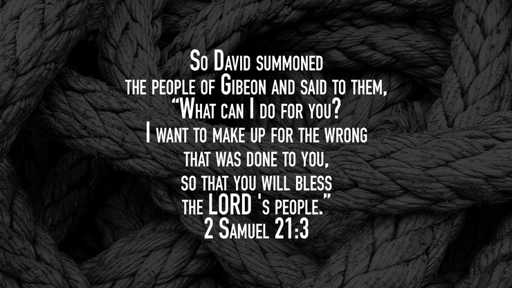 1There was a famine in the days of David three years, year after year; and David sought the face of Yahweh. Yahweh said, It is for Saul, and for his bloody house, because he put to death the Gibeonites. 2The king called the Gibeonites, and said to them (now the Gibeonites were not of the children of Israel, but of the remnant of the Amorites; and the children of Israel had sworn to them: and Saul sought to kill them in his zeal for the children of Israel and Judah); 3and David said to the Gibeonites, What shall I do for you? And with what shall I make atonement, that you may bless the inheritance of Yahweh? 4The Gibeonites said to him, It is no matter of silver or gold between us and Saul, or his house; neither is it for us to put any man to death in Israel. He said, What you shall say, that will I do for you. 5They said to the king, The man who consumed us, and who devised against us, [that] we should be destroyed from remaining in any of the borders of Israel, 6let seven men of his sons be delivered to us, and we will hang them up to Yahweh in Gibeah of Saul, the chosen of Yahweh. The king said, I will give them. 7But the king spared Mephibosheth, the son of Jonathan the son of Saul, because of Yahweh's oath that was between them, between David and Jonathan the son of Saul. 8But the king took the two sons of Rizpah the daughter of Aiah, whom she bore to Saul, Armoni and Mephibosheth; and the five sons of Michal the daughter of Saul, whom she bore to Adriel the son of Barzillai the Meholathite: 9He delivered them into the hands of the Gibeonites, and they hanged them in the mountain before Yahweh, and they fell [all] seven together. They were put to death in the days of harvest, in the first days, at the beginning of barley harvest. 10Rizpah the daughter of Aiah took sackcloth, and spread it for her on the rock, from the beginning of harvest until water was poured on them from the sky; and she allowed neither the birds of the sky to rest on them by day, nor the animals of the field by night. 11It was told David what Rizpah the daughter of Aiah, the concubine of Saul, had done. 12David went and took the bones of Saul and the bones of Jonathan his son from the men of Jabesh Gilead, who had stolen them from the street of Beth-shan, where the Philistines had hanged them, in the day that the Philistines killed Saul in Gilboa; 13and he brought up from there the bones of Saul and the bones of Jonathan his son: and they gathered the bones of those who were hanged. 14They buried the bones of Saul and Jonathan his son in the country of Benjamin in Zela, in the tomb of Kish his father: and they performed all that the king commanded. After that God was entreated for the land. 15The Philistines had war again with Israel; and David went down, and his servants with him, and fought against the Philistines. David grew faint; 16and Ishbibenob, who was of the sons of the giant, the weight of whose spear was three hundred [shekels] of brass in weight, he being girded with a new [sword], thought to have slain David. 17But Abishai the son of Zeruiah helped him, and struck the Philistine, and killed him. Then the men of David swore to him, saying, You shall go no more out with us to battle, that you don't quench the lamp of Israel. 18It came to pass after this, that there was again war with the Philistines at Gob: then Sibbecai the Hushathite killed Saph, who was of the sons of the giant. 19There was again war with the Philistines at Gob; and Elhanan the son of Jaareoregim the Bethlehemite killed Goliath the Gittite's brother, the staff of whose spear was like a weaver's beam. 20There was again war at Gath, where was a man of great stature, who had on every hand six fingers, and on every foot six toes, four and twenty in number; and he also was born to the giant. 21When he defied Israel, Jonathan the son of Shimei, David's brother, killed him. 22These four were born to the giant in Gath; and they fell by the hand of David, and by the hand of his servants.